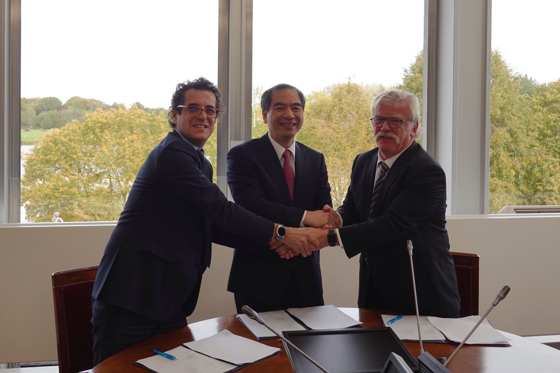 2019年10月15日,“激光驅(qū)動(dòng)多束流設(shè)施”項(xiàng)目合作備忘錄簽署儀式在法國(guó)巴黎綜合理工大學(xué)舉行。北京大學(xué)副校長(zhǎng)、設(shè)施首席科學(xué)家龔旗煌院士,巴黎綜合理工大學(xué)科研副教務(wù)長(zhǎng)Beno?t DEVEAUD,Thales集團(tuán)激光事業(yè)部主任Frank LEIBREICH分別代表三方共同簽署合作備忘錄。三方將圍繞“激光驅(qū)動(dòng)多束流設(shè)施”項(xiàng)目在科學(xué)研究、技術(shù)創(chuàng)新、建設(shè)運(yùn)行等方面開展緊密合作。