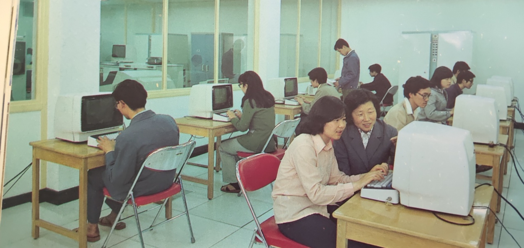 1983年,計(jì)算機(jī)科學(xué)技術(shù)系教授楊芙清(前排左二)在輔導(dǎo)研究生