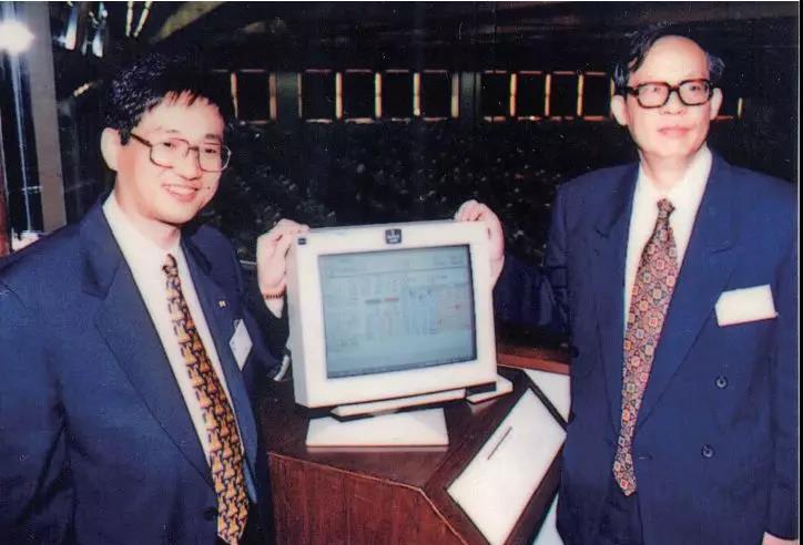 1995年12月,方正(香港)有限公司在香港聯(lián)合交易所掛牌上市,董事局主席王選(右)與總裁張旋龍?jiān)趦x式上。圖/受訪者提供