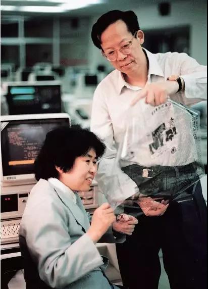 1994年,王選與妻子陳堃銶一起查看漢字激光照排系統(tǒng)輸出的排版膠片。圖/新華社