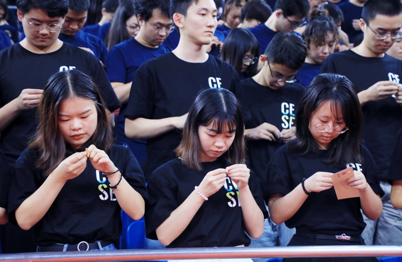 2019級(jí)研究生新生全體起立,在現(xiàn)場(chǎng)師長(zhǎng)的共同見(jiàn)證下佩戴北大校徽。從這一刻起,他們將愉快地開(kāi)啟探索、發(fā)現(xiàn)和創(chuàng)造未來(lái)的大學(xué)旅程,也意味著肩負(fù)起北大人的使命與責(zé)任。北京大學(xué)2019年研究生開(kāi)學(xué)典禮在全場(chǎng)齊唱《歌唱祖國(guó)》的歌聲中落下帷幕。