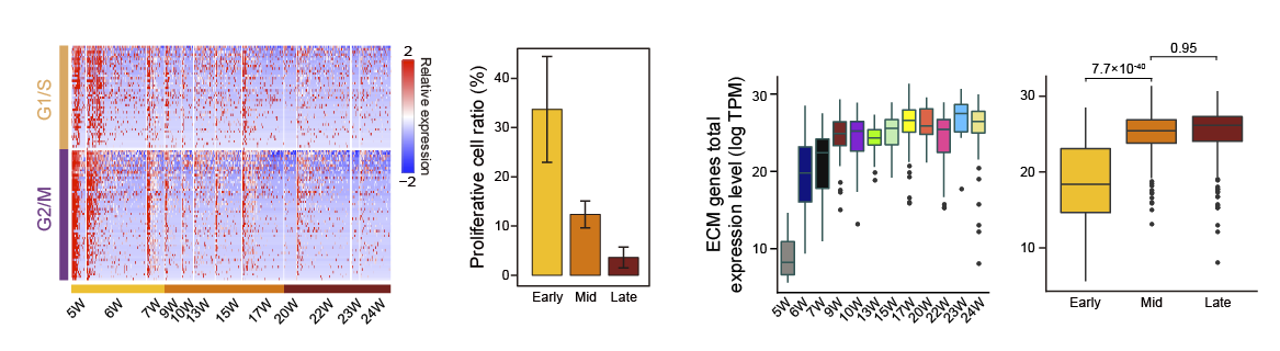 心臟發(fā)育過程中,心肌細(xì)胞和成纖維細(xì)胞呈現(xiàn)出明顯隨發(fā)育時期的變化趨勢,最顯著的特點(diǎn)是活躍增殖的細(xì)胞比例大幅度下降,細(xì)胞外基質(zhì)相關(guān)的一系列基因表達(dá)的協(xié)同上調(diào) (如圖3所示),揭示了心肌細(xì)胞和成纖維細(xì)胞功能成熟的重要標(biāo)志和關(guān)鍵分子事件。這也為研究人類多能性干細(xì)胞體外分化為功能成熟的心肌細(xì)胞提供了高精度的參比標(biāo)準(zhǔn)。