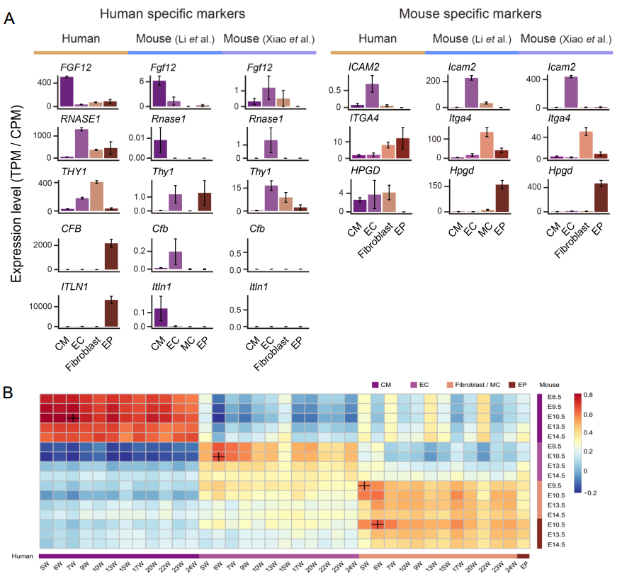 該研究通過與已經(jīng)發(fā)表的小鼠心臟發(fā)育的單細(xì)胞轉(zhuǎn)錄組數(shù)據(jù)進(jìn)行系統(tǒng)比較,鑒定出一系列人類心臟發(fā)育過程中主要細(xì)胞類型特異表達(dá)的重要基因,比如在人類心臟中,F(xiàn)GF12在心肌細(xì)胞中、RNASE1在內(nèi)皮細(xì)胞中、THY1在成纖維細(xì)胞中、CFB和ITLN1在心外膜細(xì)胞中特異高表達(dá),而這些基因在小鼠心臟對應(yīng)細(xì)胞類型中幾乎不表達(dá),是人類特異性的心臟發(fā)育重要調(diào)控基因;而在小鼠心臟中, Icam2在內(nèi)皮細(xì)胞中、Itga4在成纖維細(xì)胞中、Hpgd在心外膜細(xì)胞中特異高表達(dá),而這些基因在人類心臟對應(yīng)細(xì)胞類型中幾乎不表達(dá),是小鼠特異性的心臟發(fā)育重要調(diào)控基因(如圖4A所示)。該研究還發(fā)現(xiàn)人類與小鼠的心臟中心肌細(xì)胞是最為相似的細(xì)胞類型,而成纖維細(xì)胞等細(xì)胞類型的物種間差異較大(如圖4B所示)這為利用小鼠模型研究人類的心臟發(fā)育提供了參比標(biāo)準(zhǔn)。