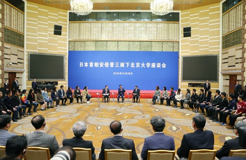 2018年10月26日下午,日本首相安倍晉三訪問北京大學(xué),與北大學(xué)子開展座談會。中國駐日本特命全權(quán)大使程永華,日本駐華大使橫井裕,外交部亞洲司參贊薛劍,教育部副部長孫堯,北京大學(xué)黨委書記、校務(wù)委員會主任邱水平,校長郝平,副校長陳寶劍共同出席座談會。