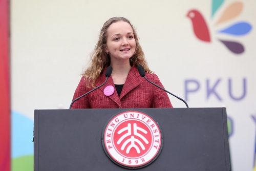 2018級俄羅斯學(xué)生娜斯佳(Anastasia Kurbatova)代表留學(xué)生發(fā)言,學(xué)校多元化的氛圍培養(yǎng)了大家的包容性與合作精神,在短短兩個(gè)月的時(shí)間里,她感受到了一個(gè)國際化的北大,校園成為重要的跨文化交流的平臺,為大家交流、合作提供了多種可能,幫助大家更好地了解世界,同時(shí)還與來自各個(gè)國家的同學(xué)們建立深厚的友誼,互相學(xué)習(xí)、共同進(jìn)步。