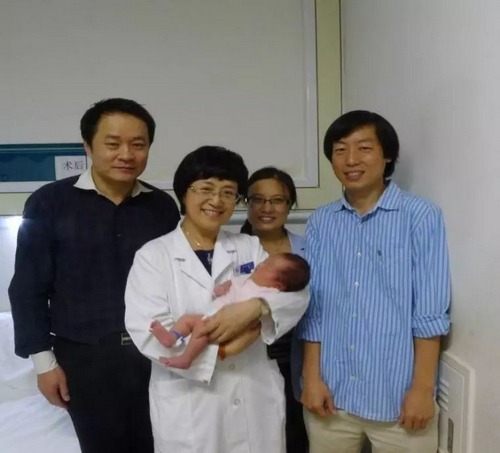 2014年,謝曉亮(左一),喬杰(左二),湯富酬(右一)在北醫(yī)三院看望第一個(gè)MALBAC嬰兒