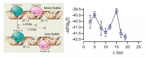 當(dāng)?shù)鞍追肿覣結(jié)合到DNA某特定位點(diǎn)上,蛋白分子B與DNA結(jié)合的穩(wěn)定性隨AB之間距離(L)變化,呈現(xiàn)出周期性振蕩,周期是10 bp(堿基),正好是DNA雙螺旋的一個(gè)周期,這種別構(gòu)效應(yīng)的大小會(huì)隨著L增加而衰減,半衰期大約為16 bp。該別構(gòu)效應(yīng)源于DNA的構(gòu)像變化:蛋白分子A的結(jié)合使附近DNA大溝間距R增加,而DNA的雙螺旋結(jié)構(gòu)使得R在L=10 bp的位點(diǎn)增加,而在L=15 bp的位點(diǎn)減小,分別造成蛋白分子B結(jié)合穩(wěn)定性的增加和減弱。
