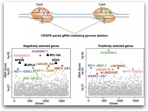使用新型CRISPR/Cas9高通量遺傳篩選技術(shù)研究長(zhǎng)非編碼RNA的基因功能-首次實(shí)現(xiàn)對(duì)染色體上“暗物質(zhì)”的功能性篩選。左右兩圖分別顯示篩選獲得的對(duì)癌細(xì)胞生長(zhǎng)至關(guān)重要或者有抑制作用的長(zhǎng)非編碼RNA【8】。