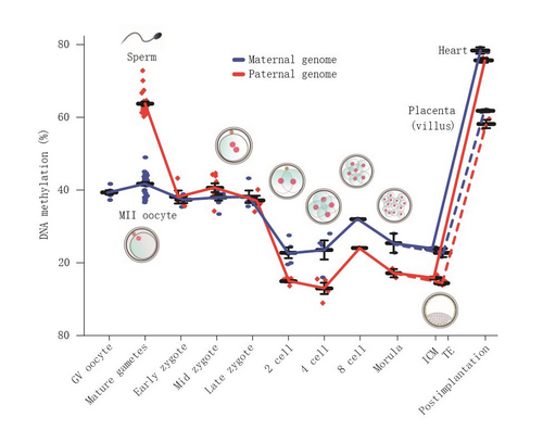 2017年12月,BIOPIC湯富酬課題組與北醫(yī)三院的喬杰課題組在《自然遺傳》在線發(fā)表論文,首次發(fā)現(xiàn)來(lái)自精子的父源基因組的DNA去甲基化速度要遠(yuǎn)快于來(lái)自卵細(xì)胞的母源基因組,以至于在著床前胚胎發(fā)育的早期,父源基因組的甲基化就已經(jīng)遠(yuǎn)低于母源基因組的甲基化【3】。