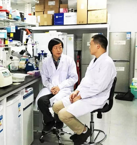 朱平與導(dǎo)師湯富酬在實(shí)驗(yàn)室討論