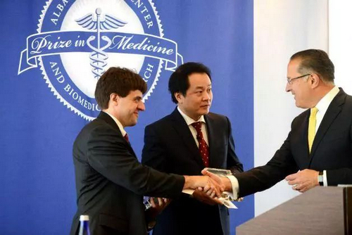 2015年謝曉亮和Karl Deisseroth(左一)獲頒阿爾伯尼獎(jiǎng),以表彰其在生物醫(yī)學(xué)研究方面的貢獻(xiàn)
