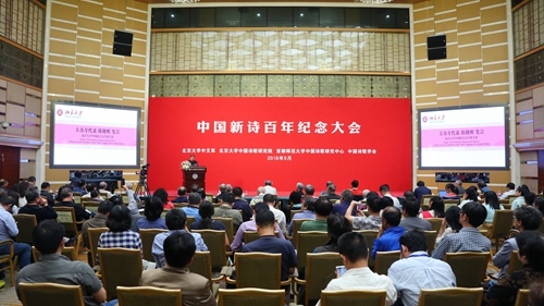 9月21日上午,中國(guó)新詩(shī)百年紀(jì)念大會(huì)在北京大學(xué)英杰交流中心陽(yáng)光大廳舉行。會(huì)議由北京大學(xué)中文系、北京大學(xué)中國(guó)詩(shī)歌研究院、首都師范大學(xué)中國(guó)詩(shī)歌研究中心與中國(guó)詩(shī)歌學(xué)會(huì)聯(lián)合主辦。北京大學(xué)校長(zhǎng)林建華、北京大學(xué)中國(guó)詩(shī)歌研究院院長(zhǎng)謝冕等出席大會(huì),300余名來(lái)自國(guó)內(nèi)外的詩(shī)人、學(xué)者,出版界、傳媒界代表以及北大師生參加大會(huì)。會(huì)議由北京大學(xué)黨委常委、黨委宣傳部部長(zhǎng)、詩(shī)歌研究院常務(wù)副院長(zhǎng)蔣朗朗主持。