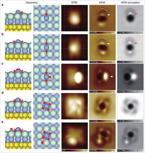 圖3 鈉離子水合物的亞分子級分辨成像。從左至右,依次為五種離子水合物的原子結構圖、掃描隧道顯微鏡圖、原子力顯微鏡圖和原子力成像模擬圖。圖像尺寸:1.5 nm ×1.5 nm。