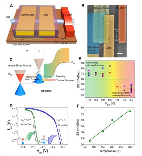 采用雙柵控制實(shí)現(xiàn)的狄拉克源晶體管結(jié)構(gòu)和性能表征,其中半導(dǎo)體碳納米管作為器件的有源溝道,源端采用一個(gè)控制柵來(lái)調(diào)節(jié)石墨烯的費(fèi)米能級(jí)