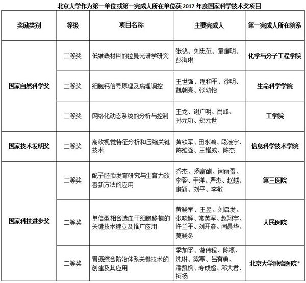 北京大學(xué)作為第一單位或第一完成人所在單位獲獎(jiǎng)7項(xiàng)。其中,國家自然科學(xué)獎(jiǎng)3項(xiàng),國家技術(shù)發(fā)明獎(jiǎng)1項(xiàng),國家科學(xué)技術(shù)進(jìn)步獎(jiǎng)3項(xiàng)*。此外,北京大學(xué)還參與完成了3項(xiàng)國家科學(xué)技術(shù)獎(jiǎng)二等獎(jiǎng)。