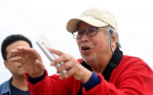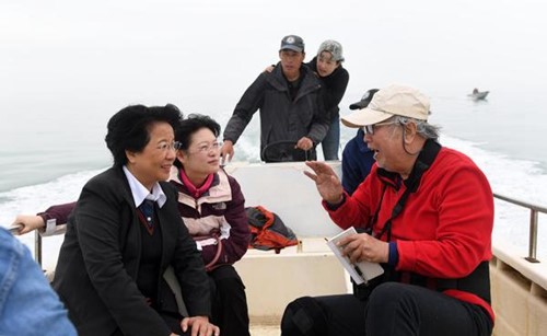 在廣西欽州市三娘灣海域,潘文石(右一)在介紹白海豚最近活動情況
