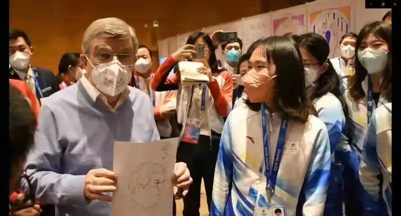 在演講結束后,北京大學冬奧志愿者、心理與認知科學學院2021級博士生周娜為巴赫送上為其現(xiàn)場創(chuàng)作的人物肖像速寫。巴赫表示感謝,稱贊周娜很有天賦。在了解到周娜的專業(yè)是心理學后,巴赫說道心理學就是需要懂得去鼓勵他人,給人陽光與溫暖。