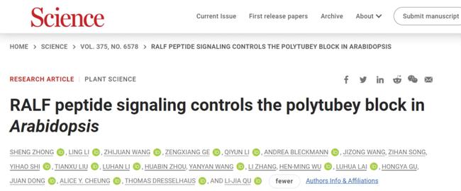 2022年1月20日,北大生命科學(xué)學(xué)院瞿禮嘉教授實(shí)驗(yàn)室的研究論文“RALF peptide signaling controls the polytubey block in Arabidopsis”以長(zhǎng)文形式在國(guó)際著名期刊《科學(xué)》(Science)上在線發(fā)表,該論文揭示了模式植物擬南芥通過(guò)小肽信號(hào)及其受體介導(dǎo)的信號(hào)通路防止多精受精的分子機(jī)制,即每個(gè)胚珠僅允許一根花粉管穿出花柱道的隔膜進(jìn)入其內(nèi)進(jìn)行受精。這是瞿禮嘉教授實(shí)驗(yàn)室繼2017年闡明花粉管爆裂釋放精細(xì)胞的分子機(jī)制(Ge et al.,Science2017)、2019年闡明擬南芥通過(guò)種屬特異性的花粉管吸引信號(hào)實(shí)現(xiàn)“同種花粉優(yōu)先”的分子機(jī)制(Zhong et al.,Science2019)之后在植物生殖生物學(xué)領(lǐng)域中取得的又一個(gè)重要突破。