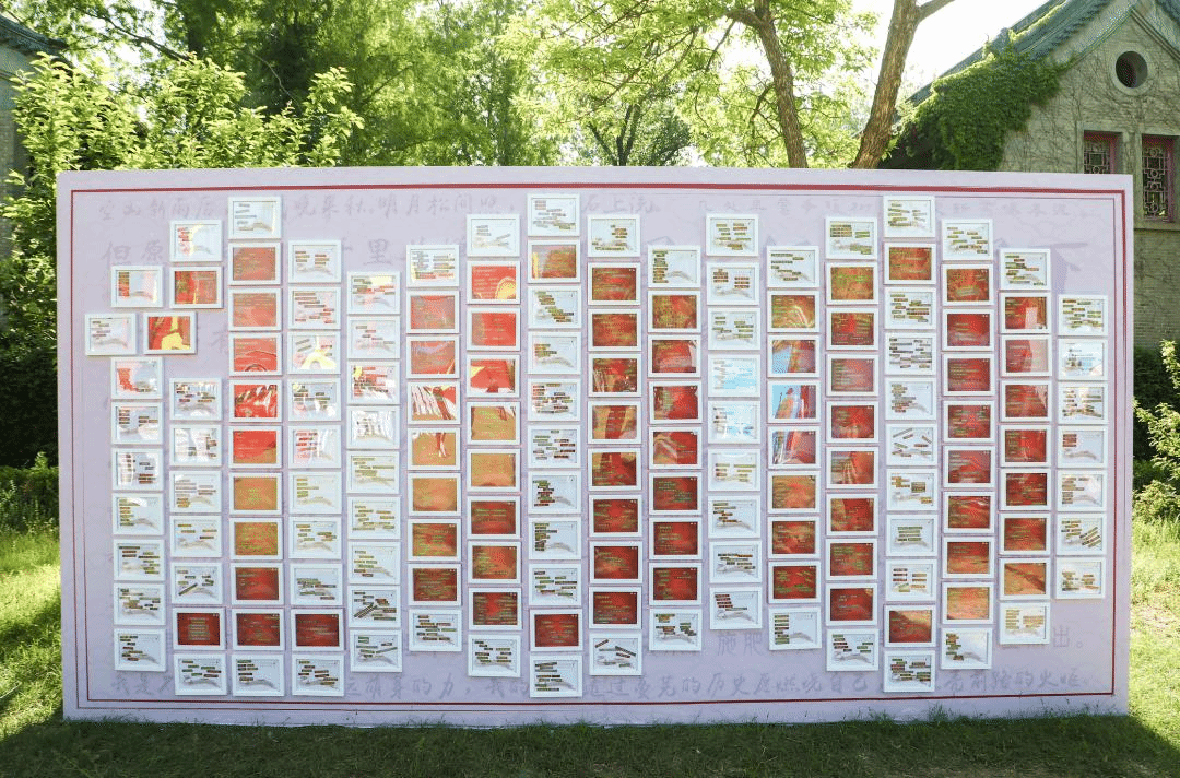 在組合成“100”的拼貼詩展板上