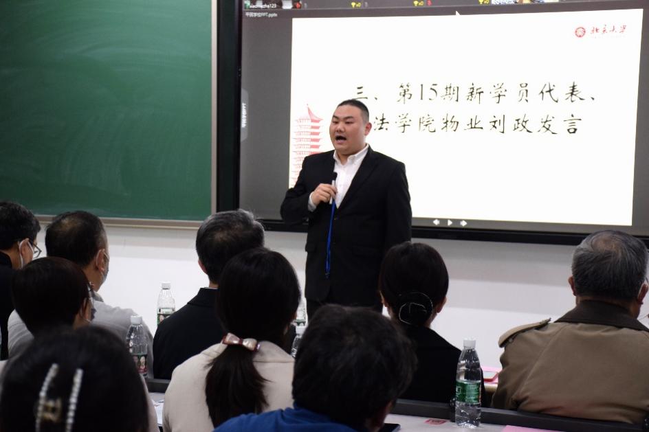 法學(xué)院物業(yè)劉政代表第15期平民學(xué)校新學(xué)員發(fā)言。2016年,當(dāng)時還在北大保安隊工作的劉政開始利用業(yè)余時間備戰(zhàn)“國家統(tǒng)一法律職業(yè)資格考試”,經(jīng)過六次努力,最終在2021年通過考試。在本次開學(xué)典禮上,劉政感謝北京大學(xué)為廣大工友提供“博雅塔下宜聆教,未名湖畔好讀書”的寶貴機會,并以自身奮斗經(jīng)歷為例,希望廣大學(xué)員們能夠在此收獲智慧、收獲友誼。