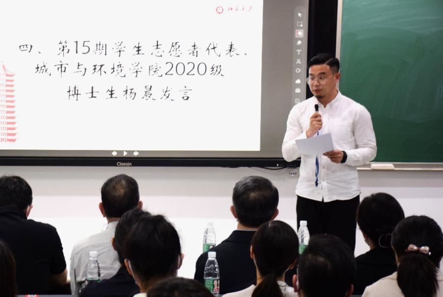 第15期學(xué)生志愿者代表、城市與環(huán)境學(xué)院2020級博士生楊晨對廣大學(xué)員為北大校園所作的奉獻表達了感謝。他表示,平民學(xué)校的學(xué)生志愿者將盡其所能,提供服務(wù),保障課程質(zhì)量,為各位學(xué)員終身學(xué)習(xí)、追求上進的夢想助推加力。
