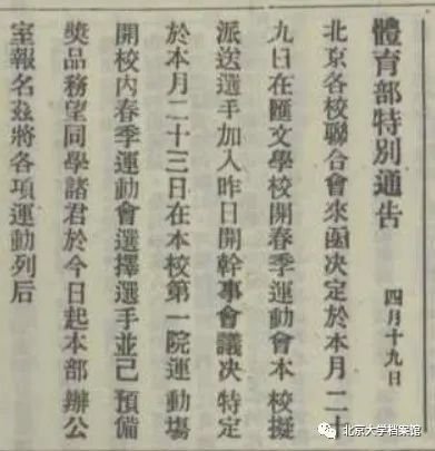 1922年4月19日,國立北京大學(xué)體育部在《北京大學(xué)日刊》上發(fā)布特別通告,鼓勵學(xué)生報名參加各項體育比賽項目,并定于本月23日舉行本校第一次校內(nèi)春季運動會。
