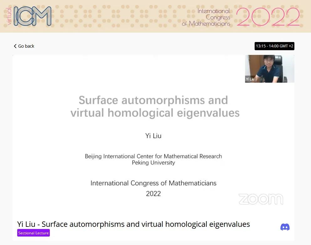 劉毅老師在本次國際數(shù)學(xué)家大會(huì)上作了題為“Surface automorphisms and virtual homological eigenvalues”報(bào)告。劉毅在低維拓?fù)漕I(lǐng)域取得基礎(chǔ)性突破,在合理的最廣泛條件下確定了L2 Alexander撓率函數(shù)的存在性和連續(xù)性,工作所建立的一系列關(guān)鍵的估計(jì)技術(shù)在其他各種撓率型不變量的研究中有廣泛的應(yīng)用前景。他的工作還觀察到新的數(shù)學(xué)現(xiàn)象,即L2 Alexander撓率函數(shù)的首項(xiàng)系數(shù)可能反映著某種雙曲體積,引起同行的興趣和進(jìn)一步探索。 劉毅報(bào)告標(biāo)題中的“庶幾”大意為“幾乎”,來源于英文“virtual”,描述了通過略去有限的信息來聚焦于更本質(zhì)的信息的一類數(shù)學(xué)構(gòu)造。而本屆大會(huì)因線上召開,名稱中同樣含有“virtual”,可以理解為是“庶幾”于面對面探討數(shù)學(xué)。劉毅打趣說,“virtual icm 2022”意味著我們用網(wǎng)絡(luò)空間代替現(xiàn)實(shí)空間來探討數(shù)學(xué),而研究庶幾同調(diào)特征值問題則意味著我們用曲面的有限覆蓋空間來研究曲面本身的特性。