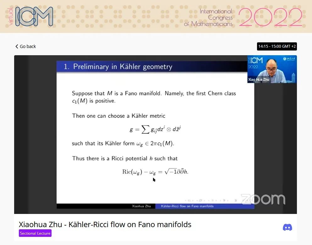 朱小華老師在本次國際數(shù)學(xué)家大會(huì)上作了題為“K?hler-Ricci flow on Fano manifolds”的報(bào)告。里奇流是幾何分析中非常重要的研究領(lǐng)域,其3維流形上的奇性分析曾被用于解決龐加萊猜想。但是高維的里奇流研究至今非常困難。朱小華教授在報(bào)告中介紹了他和合作者在凱勒流形上里奇流的收斂性和奇性結(jié)構(gòu)方面所取得的一系列成果。其中包括:法諾凱勒-愛因斯坦流形上,田-朱證明了里奇流具有光滑收斂性;一般的緊致法諾流形上,王-朱給出了漢密爾頓-田猜想的一個(gè)直接基于田的部分C^0估計(jì)的蒙葉-安倍方程方法證明;復(fù)李群緊化空間上,酈-田-朱構(gòu)造出了里奇流具有第二類奇點(diǎn)的例子。