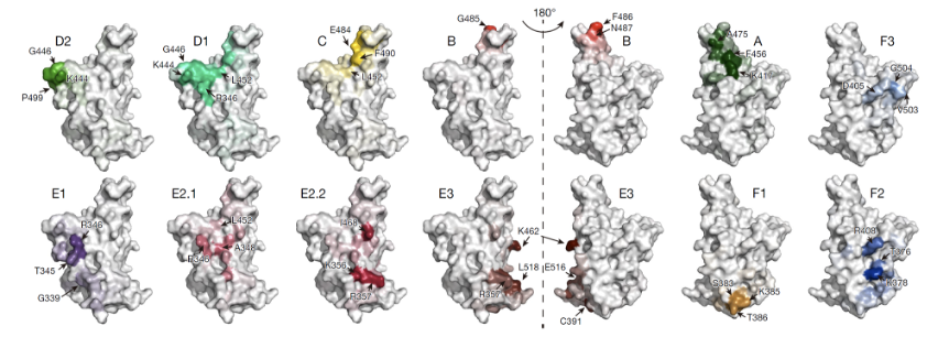 圖2.基于高通量突變掃描技術(shù)的RBD中和抗體表位分類與逃逸位點(diǎn)識別