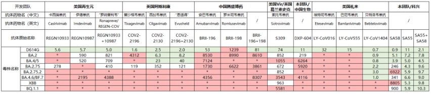 今年8月以來,上百種突變株在全球范圍內(nèi)同時出現(xiàn),且諸多突變株比BA.5更有增長優(yōu)勢,其中BQ.1和XBB兩個家族流行度最高。曹云龍及其團(tuán)隊(duì)發(fā)現(xiàn),近期流行的CH.1.1、BQ.1.1、BQ.1.1.10(BQ.1.18)和XBB顯示出更強(qiáng)的抗體逃逸能力。例如,接種疫苗后突破感染BA.5的患者,其康復(fù)一個月后的血漿雖然對于BA.5和BF.7的中和滴度較高(即防感染效果較好),但對于BQ.1.1.10(BQ.1.18)、XBB、CH.1.1等亞型的中和滴度很低,防感染作用較低。相關(guān)研究將近期在Nature6發(fā)表。