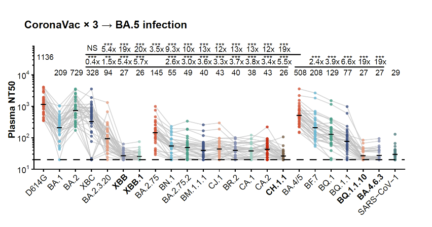 圖3.三針滅活疫苗BA.5突破感染者對不同新冠變異株的血清中和滴度