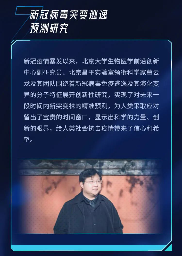 1月13日,網(wǎng)易新聞揭曉“2022中國十大科技創(chuàng)新獎”,北京大學生物醫(yī)學前沿創(chuàng)新中心(BIOPIC)、北京昌平實驗室曹云龍/謝曉亮團隊的新冠病毒突變逃逸預測研究入選,入選理由為:新冠疫情暴發(fā)以來,團隊圍繞著新冠病毒免疫逃逸及其演化變異的分子特征展開創(chuàng)新性研究,實現(xiàn)了對未來一段時間內(nèi)新突變株的精準預測,為人類采取應對留出了寶貴的時間窗口,給人類社會抗擊疫情帶來了信心和希望。