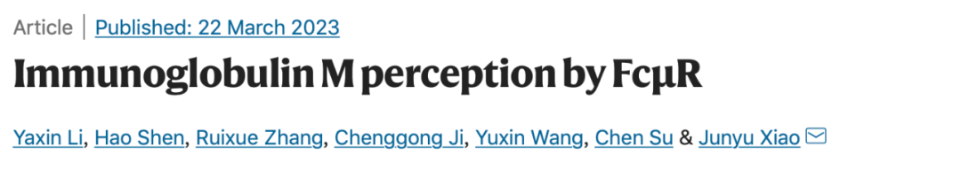 肖俊宇課題組的最新成果《FcμR受體對免疫球蛋白IgM的識別》(“Immunoglobulin Mperception by FcμR”)于3月22日在線發(fā)表于Nature,揭示了FcμR識別不同形式IgM的分子機(jī)制。這是繼2020年肖俊宇課題組在Science雜志發(fā)表論文闡明IgM五聚體組裝和黏膜轉(zhuǎn)運(yùn)的分子機(jī)制之后的又一重大突破。