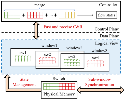 數(shù)據(jù)平面網(wǎng)絡遙測系統(tǒng)通常將網(wǎng)絡流劃分為多個窗口分別統(tǒng)計各窗口的流級信息,然而受限于可編程交換機的資源限制,現(xiàn)有工作只支持固定窗口大小的滾動窗口。論文“OmniWindow: A General and Efficient Window Mechanism Framework for Network Telemetry”提出了一個通用且高效的窗口機制框架OmniWindow,在數(shù)據(jù)面將原始窗口拆分為細粒度的子窗口進行測量,在控制面合并子窗口的測量結果,從而實現(xiàn)任意類型、大小的窗口機制。該框架設計子窗口的數(shù)據(jù)平面內存布局、同步方法以及高速狀態(tài)收集重置方案,解決了子窗口機制引入的資源開銷、一致性和切換開銷問題。該框架與1個意圖遙測系統(tǒng)和8種sketch遙測算法相結合,相比傳統(tǒng)窗口機制提升了14.3%的測量精度。該論文第一作者為計算機學院2021級博士生孫海鋒(導師黃群助理教授),作者包括黃群、李佳衡、賀錦濤和桂杰等。