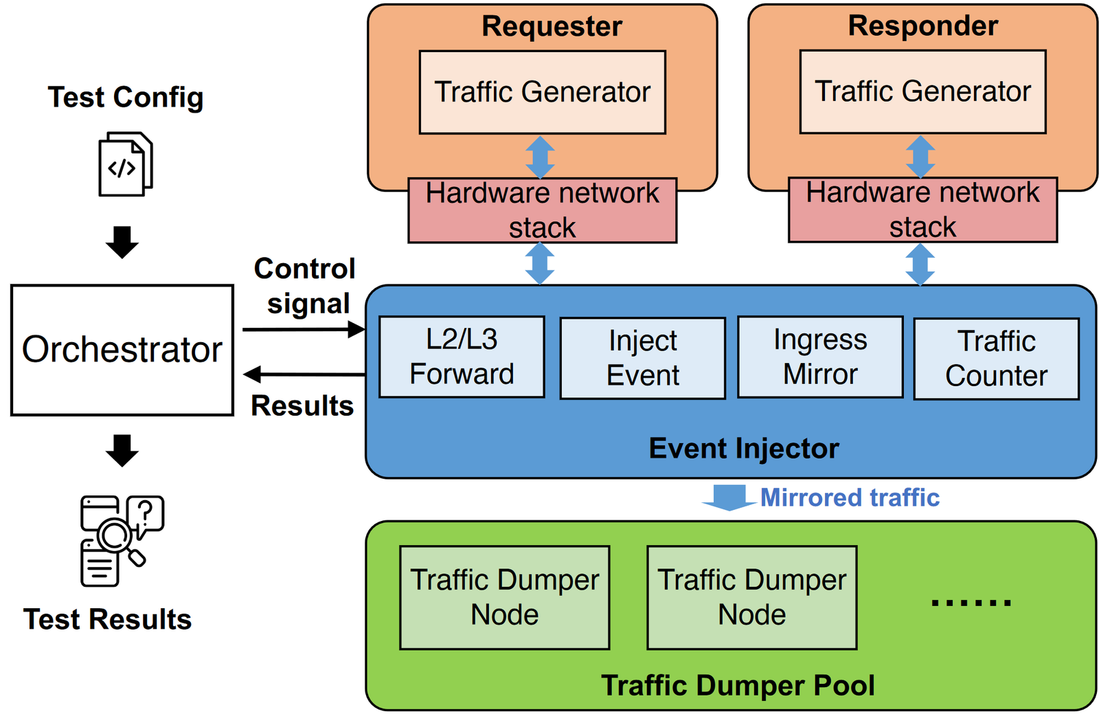 現(xiàn)代數(shù)據(jù)中心廣泛采用硬件卸載網(wǎng)絡棧(比如遠程直接內存訪問,Remote Direct Memory Access),來滿足應用高吞吐量、超低延遲和低CPU開銷的需求。為了充分利用硬件卸載網(wǎng)絡棧的性能,用戶需要深入了解它們的行為,尤其是微觀行為。盡管在測試軟件網(wǎng)絡棧方面已經(jīng)有了很多工作,但硬件網(wǎng)絡棧由于其繞過內核(kernel bypass)的特性和高性能,對測試工具提出了獨特的挑戰(zhàn)。為了測試硬件網(wǎng)絡棧的正確性和性能,論文“Understanding the Micro-Behaviors of Hardware Offloaded Network Stacks with Lumina”提出了測試工具Lumina 。Lumina利用可編程交換機來注入事件,從而模擬各種網(wǎng)絡場景;開發(fā)人員可通過其用戶友好的接口,開發(fā)精確的、可重現(xiàn)的測試。該工作使用Lumina測試了來自NVIDIA和Intel的4種RDMA網(wǎng)卡,發(fā)現(xiàn)了其中影響網(wǎng)絡性能或誤導網(wǎng)絡操作的數(shù)個bug,并捕獲了多個未準確定義的微觀行為。該工作中發(fā)現(xiàn)的嚴重bug已收到供應商確認并將在未來版本中進行修復。該論文第一作者為約翰霍普金斯大學余卓隆(導師金鑫和Vladimir Braverman教授),第二作者為2020級本科生蘇博文(導師金鑫),作者包括金鑫,微軟研究院白巍,Google公司Shachar Raindel和萊斯大學Vladimir Braverman等。