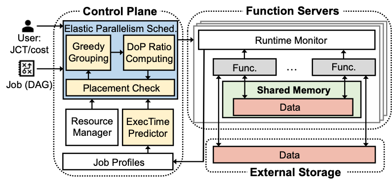 服務器無感知計算平臺具有細粒度的資源彈性,適合運行并行任務組成的數(shù)據(jù)分析作業(yè)。現(xiàn)有的服務器無感知數(shù)據(jù)分析調度器的并行度配置策略未能綜合考慮服務器無感知特有的優(yōu)化目標(如單作業(yè)完成時間和運行成本),并且不能感知服務器內部和服務器之間不同的通信開銷對優(yōu)化目標的影響。針對此問題,論文“Ditto: Efficient Serverless Analytics with Elastic Parallelism”提出了支持彈性并行調度的Ditto系統(tǒng)。該系統(tǒng)基于作業(yè)各階段的并行時間特征、階段間數(shù)據(jù)依賴關系和可用資源分布聯(lián)合優(yōu)化作業(yè)的并行度配置和階段間通信,相比傳統(tǒng)方法達到了更低的作業(yè)完成時間,節(jié)省了運行成本。該論文第一作者為2019級本科生金超(導師金鑫),作者包括金鑫、劉譞哲,北京大學黃罡教授、章梓立、向星雨和鄒松運等。
