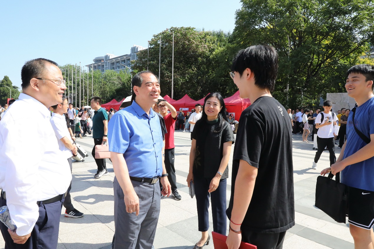 上午,校黨委書記郝平、校長龔旗煌來到邱德拔體育館報到現場,全流程視察和指導迎新工作,與報到新生及家長親切交流、合影留念,慰問工作人員和志愿者。校黨委常委、副校長、教務長王博,校黨委副書記、紀委書記,國家監(jiān)委駐北京大學監(jiān)察專員顧濤,校黨委副書記、副校長寧琦以及相關職能部門負責人陪同。