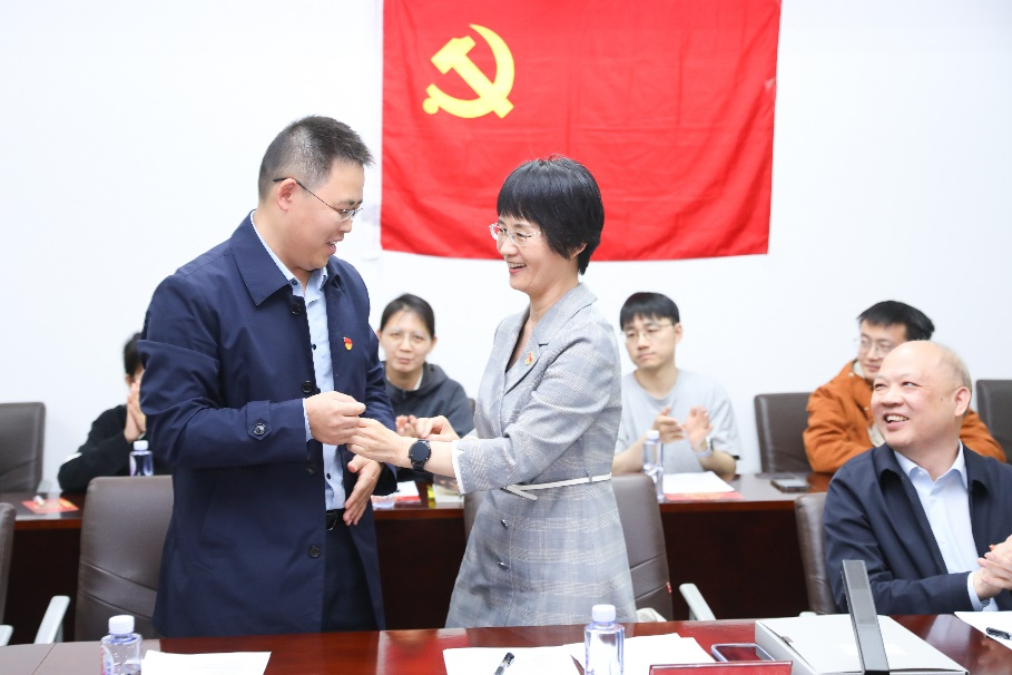 物理學(xué)院現(xiàn)代光學(xué)研究所黨支部書(shū)記楊宏為剛剛成為中國(guó)共產(chǎn)黨預(yù)備黨員的肖云峰教授佩戴黨徽