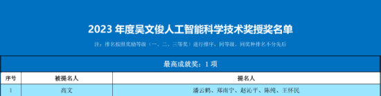 2024年3月7日,中國人工智能學(xué)會(huì)發(fā)布《2023年度吳文俊人工智能科學(xué)技術(shù)獎(jiǎng)獎(jiǎng)勵(lì)公告》,中國工程院院士、北京大學(xué)計(jì)算機(jī)學(xué)院博雅講席教授高文獲得“吳文俊人工智能科學(xué)技術(shù)獎(jiǎng)最高成就獎(jiǎng)”。