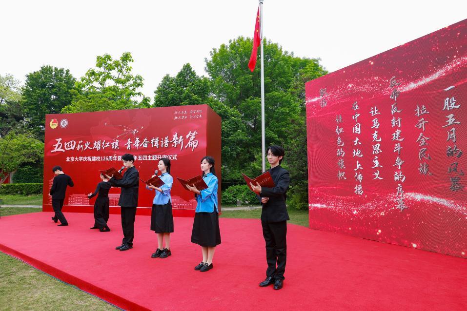 為深入學(xué)習(xí)貫徹習(xí)近平總書記五四青年節(jié)對全國廣大青年重要寄語精神,激勵青年學(xué)思踐悟習(xí)近平新時代中國特色社會主義思想,傳承五四精神,爭做“有理想、敢擔(dān)當(dāng)、能吃苦、肯奮斗”的新時代好青年,5月4日,“五四薪火耀紅旗,青年奮楫譜新篇”北京大學(xué)慶祝建校126周年暨2024年五四主題升旗儀式在靜園草坪舉行。參加儀式的有共青團中央書記處第一書記阿東、書記處書記胡百精等團中央領(lǐng)導(dǎo),北京大學(xué)黨委書記郝平、校長龔旗煌等校領(lǐng)導(dǎo)班子成員,全校40余個院系的黨政領(lǐng)導(dǎo)和相關(guān)職能部門負(fù)責(zé)人,學(xué)生工作系統(tǒng)干部及學(xué)生代表等。浙江嘉興南湖革命紀(jì)念館、遼寧撫順雷鋒旅、河北樂亭李大釗紀(jì)念館、云南彌渡第一完全中學(xué)、內(nèi)蒙古奮斗中學(xué)、新疆廟爾溝中學(xué)、青海朔山中學(xué)、西藏拉薩中學(xué)、河北安新中學(xué)的干部和師生代表與北大校園主會場云端連線,十地同升國旗。升旗儀式由北京大學(xué)黨委組織部常務(wù)副部長吳艷紅主持。