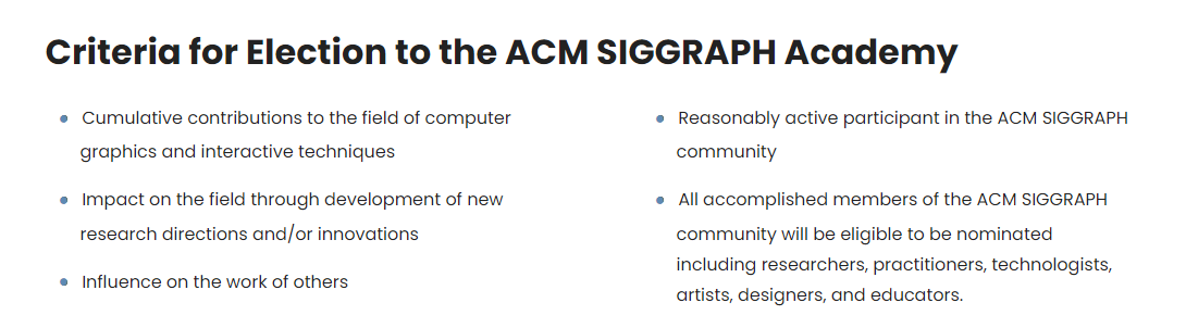 首屆ACM SIGGRAPH Academy入選的會(huì)員為該會(huì)議歷史上終身成就獎(jiǎng)和杰出貢獻(xiàn)獎(jiǎng)獲得者,此后每年通過推薦、評(píng)選產(chǎn)生,歷史累計(jì)入選者共計(jì)92人。據(jù)ACM官網(wǎng)介紹,入選學(xué)院的標(biāo)準(zhǔn)包括:對(duì)計(jì)算機(jī)圖形學(xué)和交互技術(shù)領(lǐng)域研究作出突出貢獻(xiàn);開創(chuàng)新的研究方向或?qū)ρ芯款I(lǐng)域產(chǎn)生卓越影響;代表性/具有啟發(fā)性的研究工作;積極參與社區(qū)活動(dòng)當(dāng)然,除了技術(shù)創(chuàng)新外,能夠入選Academy的也有藝術(shù)、教育、服務(wù)以及技術(shù)實(shí)踐等方面的杰出貢獻(xiàn)者。
