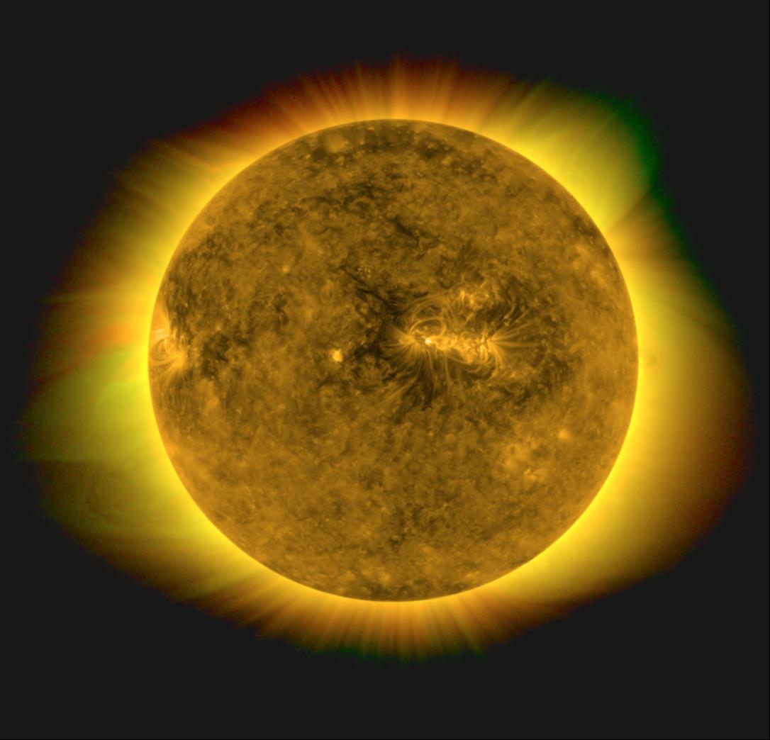 2017年美國日全食期間,北京大學(xué)拍攝的日冕紅線圖像與云南天文臺(tái)拍攝的日冕綠線圖像、美國SDO衛(wèi)星拍攝的日面圖像拼接而成的日冕圖像(EPP,1, 68, 2017)