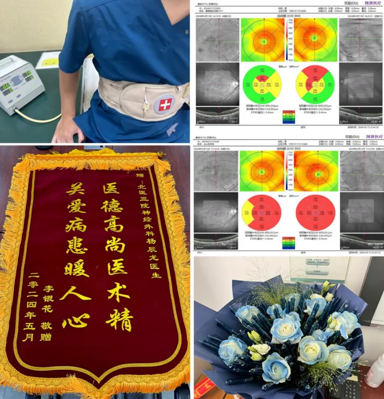 △腹壓調(diào)控設(shè)備(左上)及其功能驗(yàn)證(右上)、李女士贈(zèng)送的錦旗(左下)及用心良苦精心制作的“處方筆之花”(右下)