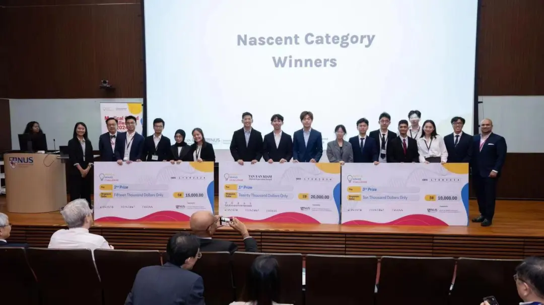 △決賽頒獎(jiǎng)儀式,左一:Lee Yinn Yi,MGC聯(lián)合主席 左二:Chong Yap Seng教授,新加坡國立大學(xué)醫(yī)學(xué)院院長,右三至右八:The Neurovisionaries團(tuán)隊(duì)成員 右二:Wang Weihan, MGC聯(lián)合主席 右一:Dinesh Visva Gunasekeran教授,MGC學(xué)術(shù)負(fù)責(zé)人