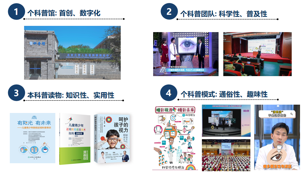 近視及高度近視會造成視覺功能受損和嚴(yán)重的眼底并發(fā)癥等狀況,導(dǎo)致不可逆轉(zhuǎn)的視力損失,甚至失明,已成為中國的常見疾病。“科學(xué)護(hù)眼科技同行近視防控科普系列作品”由李巖教授帶隊(duì),形成1個(gè)科普館、2個(gè)科普團(tuán)隊(duì)、3本科普圖書、4個(gè)科普模式。搭建全國首家“AR元宇宙裸眼3D近視防控科普館”實(shí)現(xiàn)虛擬化、沉浸式、無穿戴設(shè)備的虛實(shí)混合的科普宣教空間,讓參觀者體驗(yàn)到場景化、外延化、參與式的近視防控科普效果。由李巖和王凱教授帶領(lǐng)的兩個(gè)科普團(tuán)隊(duì),利用大眾媒體及線上自媒體平臺,參加北京電視臺“我是大醫(yī)生”欄目,開設(shè)抖音、微信視頻號、公眾號、微博、今日頭條等多平臺賬號,以動畫、情景劇等形式科普近視防控知識,增加趣味性。李巖和王凱作為主編編寫《有陽光·有未來——兒童青少年防控近視科普常識》《兒童青少年近視防控適宜技術(shù)指南(2022)漫畫版》《呵護(hù)孩子的視力》等科普讀物。充分利用北大人民醫(yī)院眼視光中心近視防控眼科專家團(tuán)隊(duì)優(yōu)勢,通過科普視頻、科普講座、科普讀物、科普展演模式,進(jìn)行近視防控科普,內(nèi)容兼顧科學(xué)性、通俗性和趣味性。