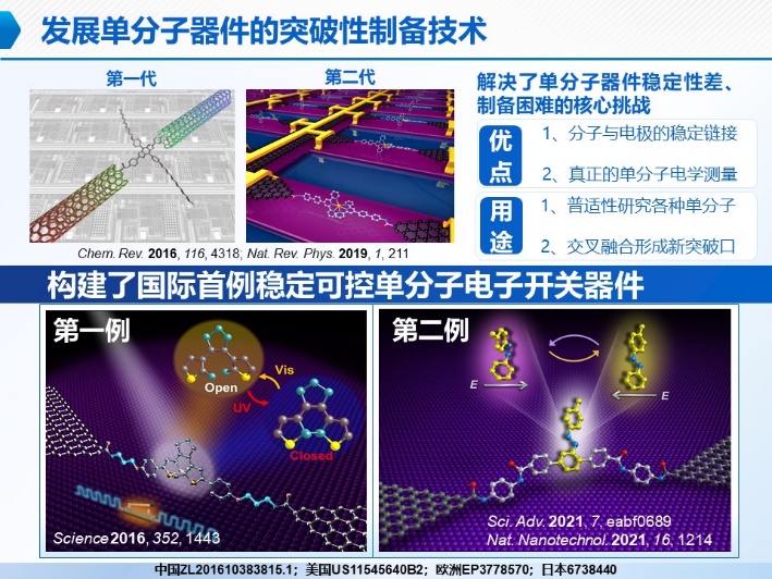利用單個(gè)分子來構(gòu)建功能光電子器件不僅有可能滿足器件的微小化乃至高度集成的需求,也可為研究材料在分子水平上的本征物理化學(xué)現(xiàn)象和規(guī)律提供關(guān)鍵技術(shù),是未來分子光電子器件研發(fā)的科學(xué)基礎(chǔ)。針對分子電子器件中存在的接觸界面相關(guān)的基本科學(xué)問題,郭雪峰教授帶領(lǐng)的團(tuán)隊(duì)歷經(jīng)長期努力,建立和完善了制備穩(wěn)定單分子器件的突破性方法,構(gòu)建了國際首例穩(wěn)定可控的單分子電子開關(guān)器件,發(fā)展了單分子電學(xué)檢測的關(guān)鍵性技術(shù),發(fā)展了單分子電子學(xué)譜的普適性譜學(xué)方法,開拓了具有中國標(biāo)簽的單分子化學(xué)反應(yīng)動力學(xué)的特色研究領(lǐng)域。項(xiàng)目執(zhí)行期間,共發(fā)表SCI論文165篇(其中影響因子大于10的超過95篇),5篇代表性論文分別發(fā)表在Science、Chem. Rev.、Nat. Rev. Phys.、Nat. Nanotechnol.和Sci. Adv.上,應(yīng)邀出版專業(yè)書籍2本。研究成果受到國內(nèi)外科學(xué)家的正面引用和積極評價(jià),被Science、C&EN、Chemistry World、National Science Review、Chemistry World、《中國科學(xué)報(bào)》、《中國科學(xué)基金》和《化學(xué)進(jìn)展》等雜志和媒體亮點(diǎn)報(bào)道50余次,成果入選“中國高等學(xué)校十大科技進(jìn)展”和“中國十大科學(xué)進(jìn)展”。團(tuán)隊(duì)成員作為首席科學(xué)家或負(fù)責(zé)人分別承擔(dān)了科技部重大研究計(jì)劃項(xiàng)目和國家自然科學(xué)基金委重點(diǎn)項(xiàng)目、國家杰出青年科學(xué)基金項(xiàng)目、原創(chuàng)探索計(jì)劃項(xiàng)目以及重大科研儀器研制項(xiàng)目等。