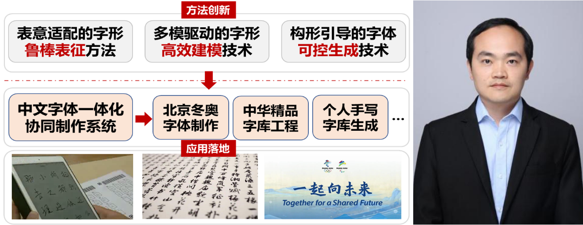 發(fā)展人工智能與建設(shè)文化強(qiáng)國是新時(shí)代國家重大戰(zhàn)略需求,漢字是中華文化之本,是建立國家文化自信之基。如何借力人工智能技術(shù)尤其是人工智能生成內(nèi)容技術(shù)(AIGC)來推動中國文字在信息時(shí)代的進(jìn)一步發(fā)展和傳播,對國人增強(qiáng)文化自信、推進(jìn)中華民族偉大復(fù)興具有重大意義。本項(xiàng)目歷經(jīng)10余年持續(xù)研發(fā),率先突破中國文字的字體智能計(jì)算核心方法與自動生成關(guān)鍵技術(shù),推動各類中文字體設(shè)計(jì)制作技術(shù)和工藝的變革。相關(guān)技術(shù)和系統(tǒng)應(yīng)用于方正手跡、方正電子、華為、金山WPS等企業(yè),顯著提升各類中文字體的開發(fā)效率,大幅降低中文字庫的制作成本,使得大規(guī)模制作各種書寫與設(shè)計(jì)風(fēng)格的高質(zhì)量中文字庫成為可能。應(yīng)用于北京冬奧官方專用字體設(shè)計(jì)和國家新聞出版署“中華字庫工程”,讓漢字在信息時(shí)代中得以更好地發(fā)展和傳播,進(jìn)一步提升中華民族的文化自信,取得良好的經(jīng)濟(jì)和社會效益。獲授權(quán)發(fā)明專利53項(xiàng),在國際會議(SIGGRAPH、CVPR等)和期刊(TPAMI、IJCV、TOG等)上發(fā)表學(xué)術(shù)論文125篇,獲中國專利優(yōu)秀獎(jiǎng)、吳文俊人工智能優(yōu)秀青年獎(jiǎng)等獎(jiǎng)勵(lì)。