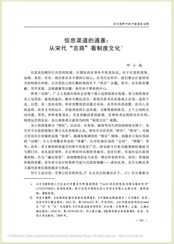 聚焦于這一關(guān)鍵問(wèn)題,鄧小南教授以宋廷上下圍繞信息流通的種種政治運(yùn)作為切入角度,寫(xiě)成《信息渠道的通塞:從宋代“言路”看制度文化》一文,刊發(fā)于《中國(guó)社會(huì)科學(xué)》2019年第1期。