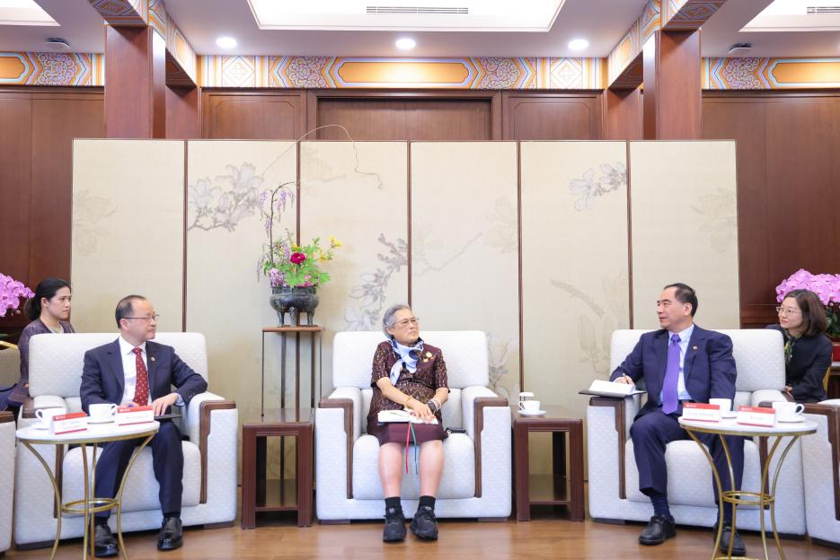 何光彩熱情歡迎詩(shī)琳通公主來(lái)訪,對(duì)公主長(zhǎng)期以來(lái)對(duì)北大的支持表示感謝。他指出,中泰兩國(guó)地緣相近、血緣相親、人文相通,中泰友好傳承千年,“中泰一家親”歷久彌新。自1975年兩國(guó)正式建交以來(lái),兩國(guó)友好合作關(guān)系不斷鞏固發(fā)展。他回顧了詩(shī)琳通公主與北京大學(xué)20余年的美好緣分,公主作為北京大學(xué)的杰出校友,始終關(guān)心和支持學(xué)校發(fā)展,為增進(jìn)和推動(dòng)中泰友誼和人文交流傾注了大量心血。北京大學(xué)愿繼續(xù)秉持開放包容、互學(xué)互鑒的精神,為促進(jìn)兩國(guó)民心相通、構(gòu)建周邊命運(yùn)共同體和人類命運(yùn)共同體貢獻(xiàn)北大力量。