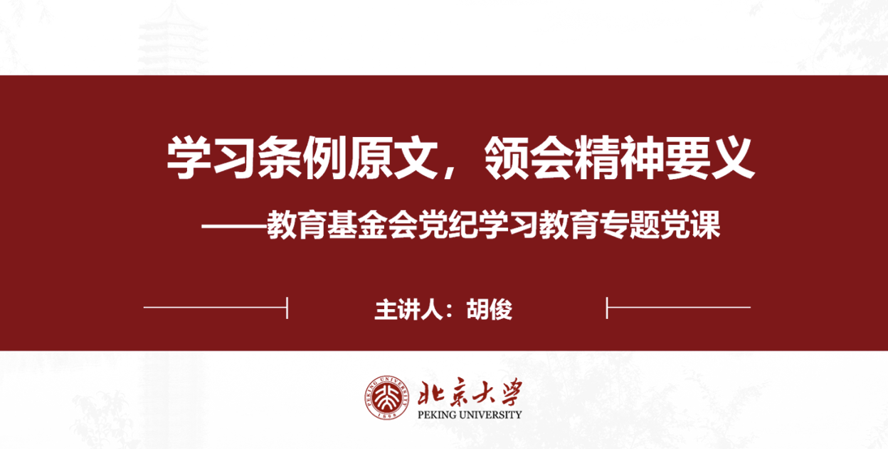為貫徹中共中央辦公廳《關(guān)于在全黨開展黨紀(jì)學(xué)習(xí)教育的通知》精神,落實(shí)學(xué)校黨委和直屬單位黨委有關(guān)部署,深入開展黨紀(jì)學(xué)習(xí)教育,6月3日下午,基金會(huì)黨支部在北大之友報(bào)告廳舉辦黨紀(jì)學(xué)習(xí)教育專題黨課,基金會(huì)黨支部書記胡俊面向全體支部黨員和工會(huì)小組成員講授了一堂題為“學(xué)習(xí)條例原文,領(lǐng)會(huì)精神要義”的生動(dòng)黨課。